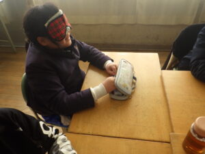 4年生がアイマスク体験をしました。アイマスクをつけて赤鉛筆を見つけたりや介助方法について学習したりしました。